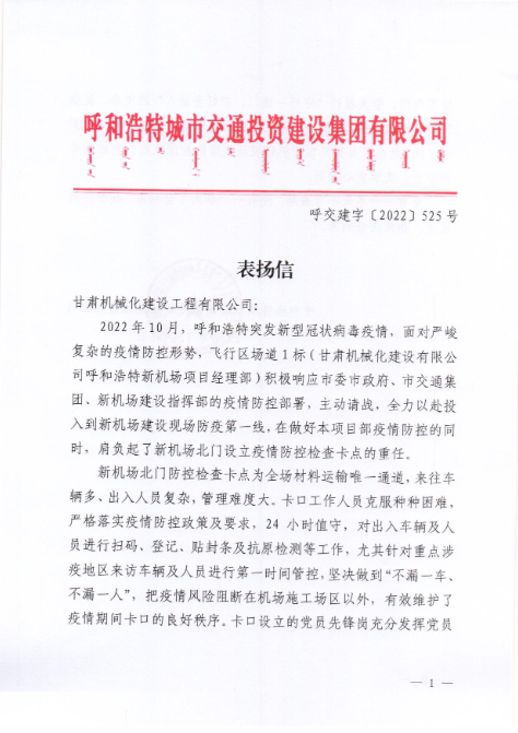 2022年12月7日,呼和浩特市交通投資建設集團有限公司給我司發(fā)來表揚信,表揚信中充分肯定了我司呼和浩特新機場項目部在疫情防控工作上作出的努力,展現(xiàn)了我司的社會責任與擔當。